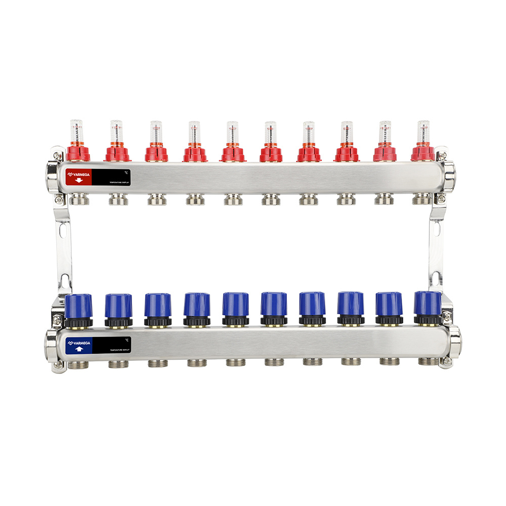 Коллекторные группы предварительной сборки из нержавеющей стали с расходомерами марки Varmega предназначены для распределения и регулирования потоков теплоносителя в низкотемпературных системах отопления (напольное отопление). Оснащены расходомерами на подающем коллекторе и термостатическими вентилями с размером M30x1,5 (с возможностью установки термоэлектрических приводов) на обратном коллекторе. Каждый коллектор подвергается в заводских условиях проверке на функционирование и герметичность уплотнений.